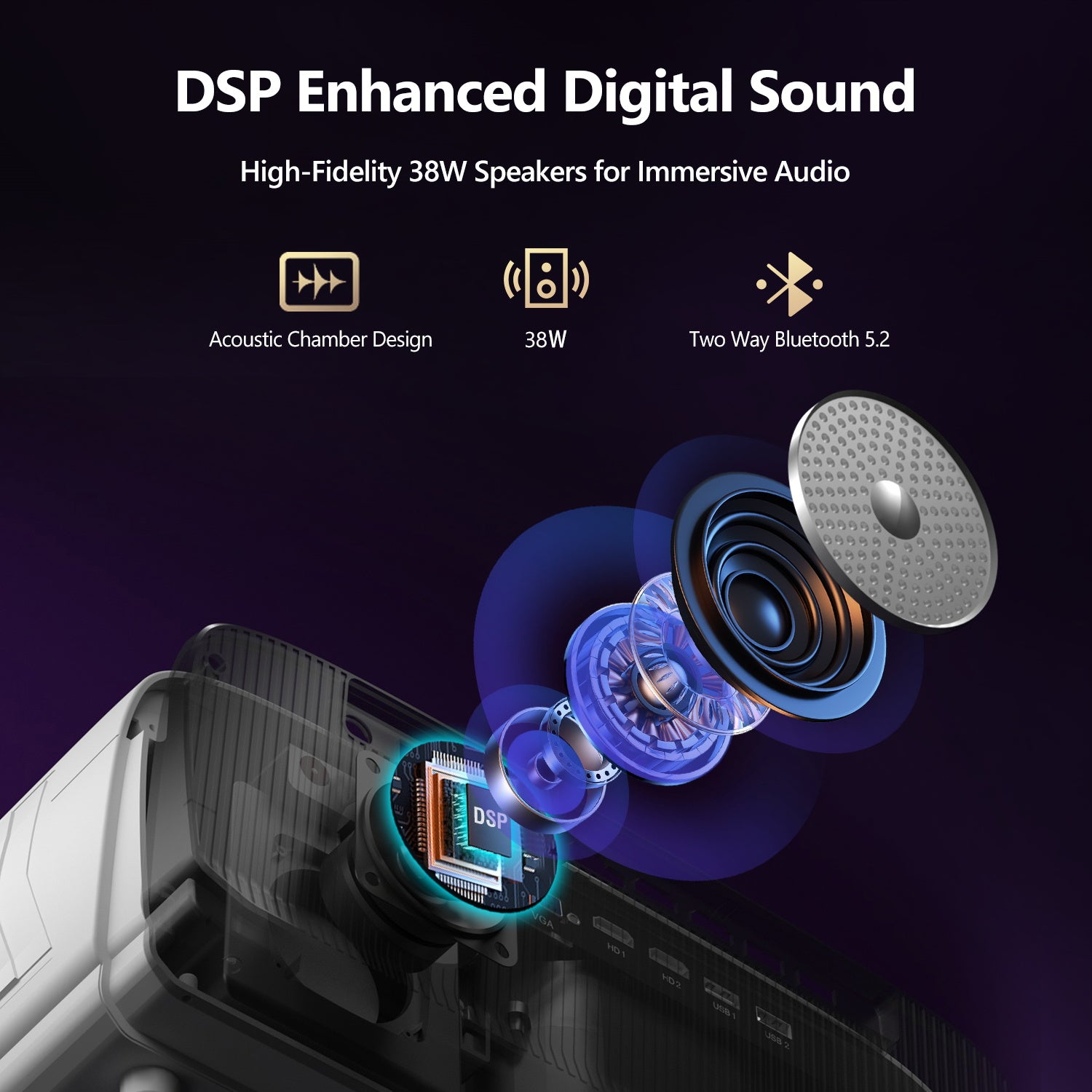 - 【Advanced Bluetooth 5.2 & Immersive Audio】 The Bluetooth projector features the latest Bluetooth 5.2 chip, ensuring a stable connection with various devices like Bluetooth speakers and headphones, catering to diverse audio needs across different occasions. Elevate your auditory experience with the built-in 20W stereo speaker, delivering pristine audio fidelity and crystal-clear sound quality. Every sound is reproduced with remarkable precision and depth, enhancing your audiovisual experience.