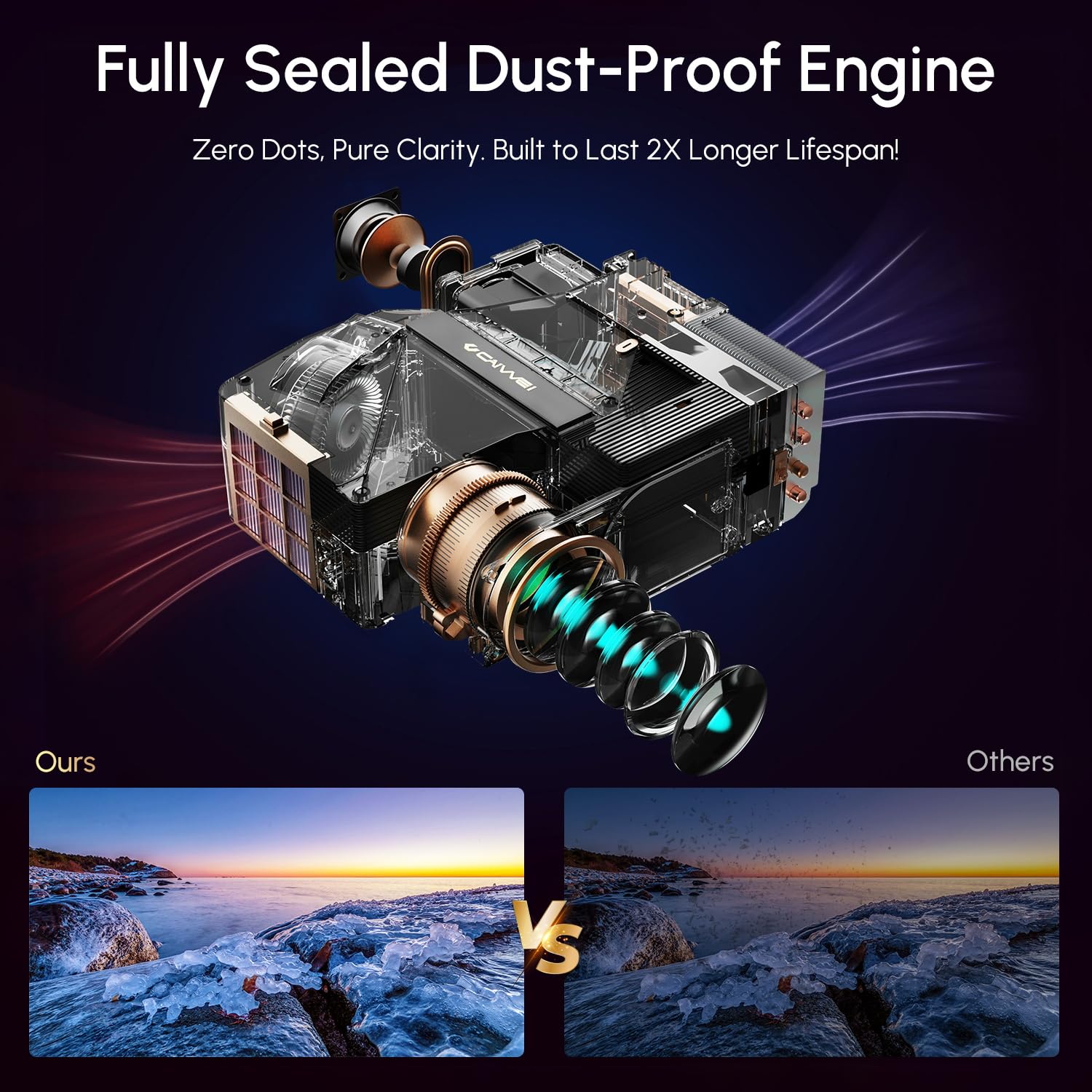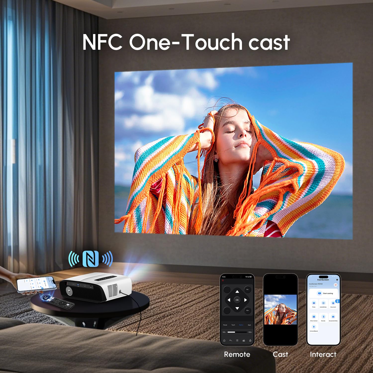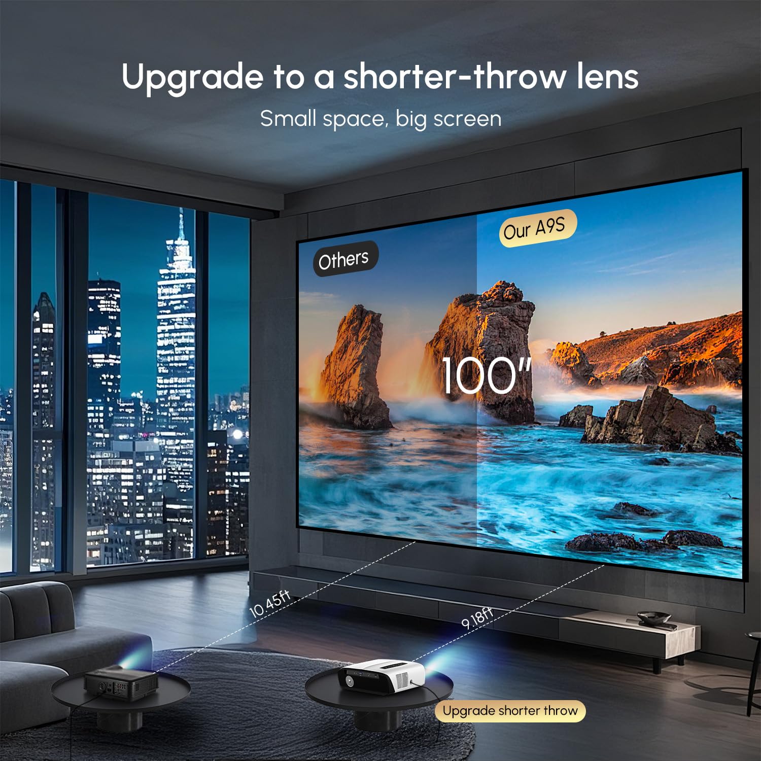 - [Smart Projection Reimagined] This 2025 updated projector combines space-defying short-throw optics to deliver a cinematic 100" display from just 9.18 feet, ideal for living rooms, apartments, or bedrooms. Powered by 3-in-1 CMOS module, its intelligent ToF technology achieves near-silent, instant auto-focus and keystone correction - operating 30% faster than conventional systems.