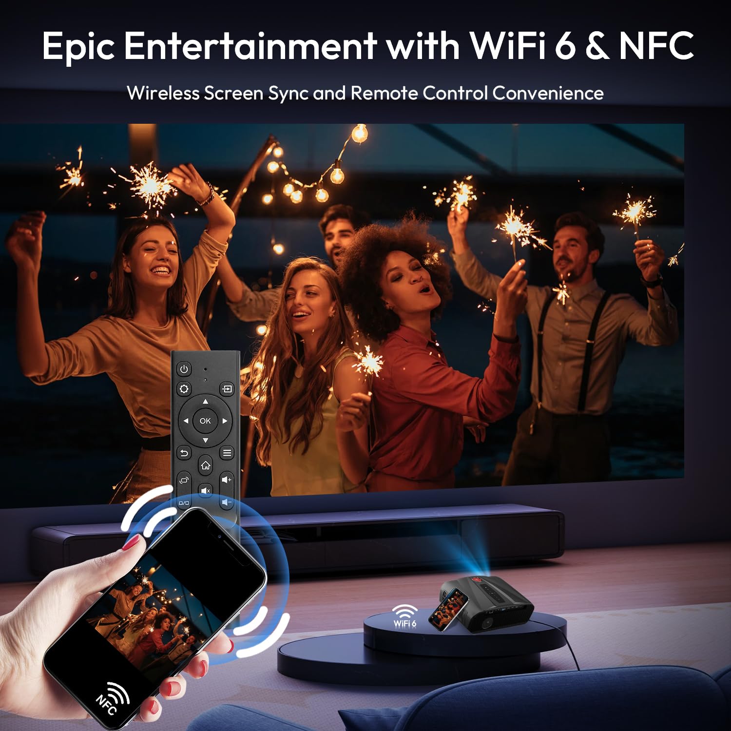 - [Newest NFC Function] Pair your smart projector wirelessly with just one-second touch, allowing you to effortlessly cast your screen and remotely control the projector